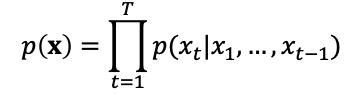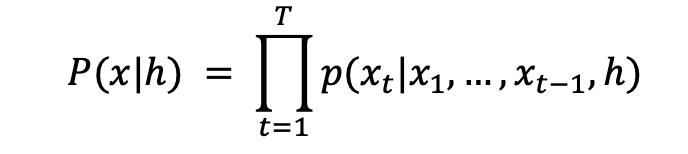 Waveform $\textbf{x} = \{x_1, ..., x_T\}$의 joint probability는 다음과 같이 표현된다. 즉, 각 오디오 샘플 $x_t$는 이전 모든 샘플들에 대해 conditioned 된다.