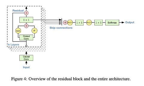 본 Wavenet 모델의 전반적인 구조이다. Causal convolution을 한번 거친 후 K번의 residual block을 거치며, convergence를 빠르게 하고 deep 한 모델의 학습을 위해 residual skip connection(아래 그림에서 residual)과 parameterised skip connection(아래 그림에서 skip connection)이 residual block에서 활용되었다.