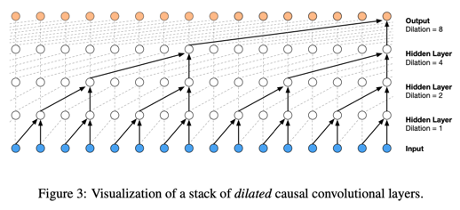 (2) Raw audio generation을 위해 필요한 long-range temporal dependencies를 처리하기 위해, Wavenet에는 굉장히 넒은 receptive fields를 가지는 dilated causal convolutions이란 새 구조가 적용됨.